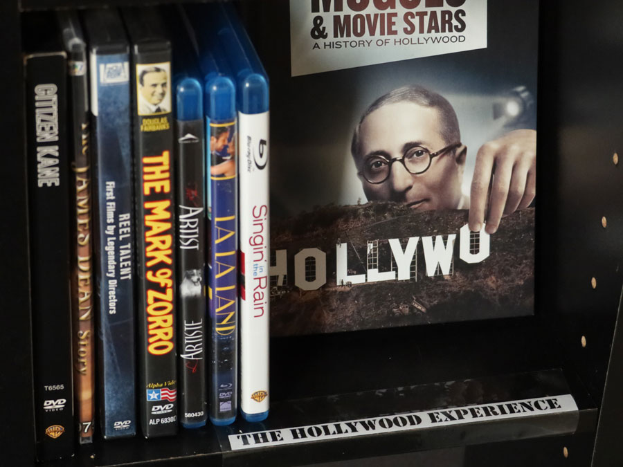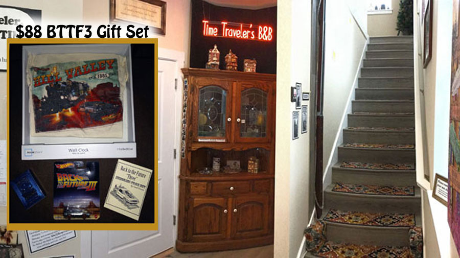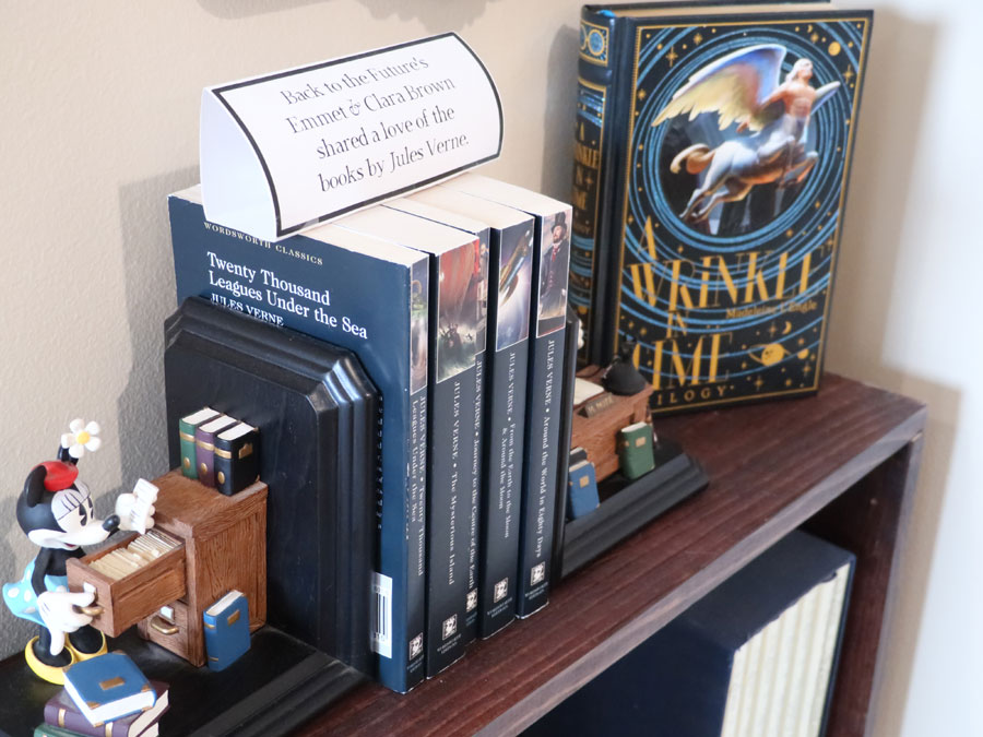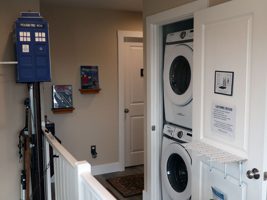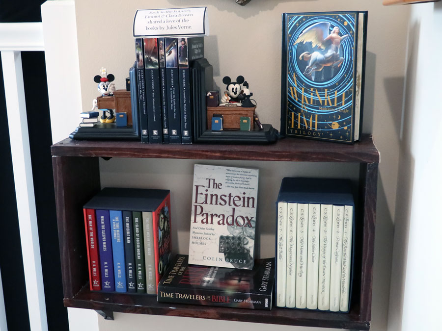 The upper landing of the stairwell is where you off-load the luggage lift. Next, meet the many faces of Doctor Who and his plucky companions. When you're ready, this is where you find the Laundry closet, DVD library and Book library. These windows overlook a cow, car and hay farm. Keep a sharp eye for the cows or small aircraft in the distance. The DVD movie collection is a curated library of the best Time Travel, Multiverse and adventure movies and shows. Many are not available on streaming services so this is your chance to watch some rare movies. There are movies for kids, musicals, classics, adventures, inspirational, Christmas and Hollywood history documentaries. The Book collection contains the entire works of H.G. Wells, Jules Verne, C.S. Lewis' Narnia series, and the Wrinkle in Time trilogy. You can also read about Industrial Light and Magic or Walt Disney Imagineering. |