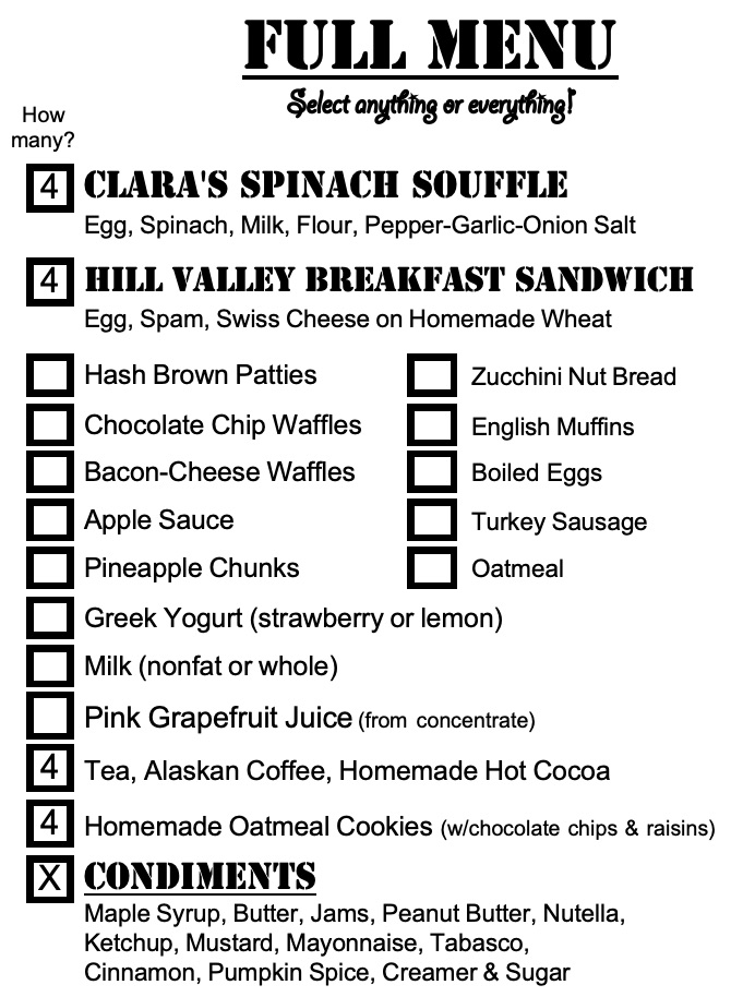 Website bookings include the full breakfast buffet menu every day of your stay. You reserve with a contract and pay by Cash, Check, or Electronically. Those who book through a service like AirBnB or VRBO get the full breakfast buffet only once.